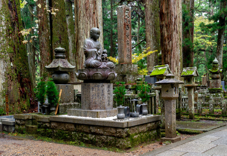 Hřbitov, který se nachází na Mt.Koya, se rozkládá v prostoru dlouhém na délku přes 2 km a je ponořen do lesa vysokých jehličnanů.